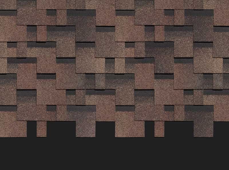 Несимметричный перехлест лепестков гонтов подчеркивает выразительный эффект тени. Кровля визуально смотрится объемной. Черепица в приглушенных тонах хорошо сочетается со светлым сайдингом под камень и клинкерный кирпич.