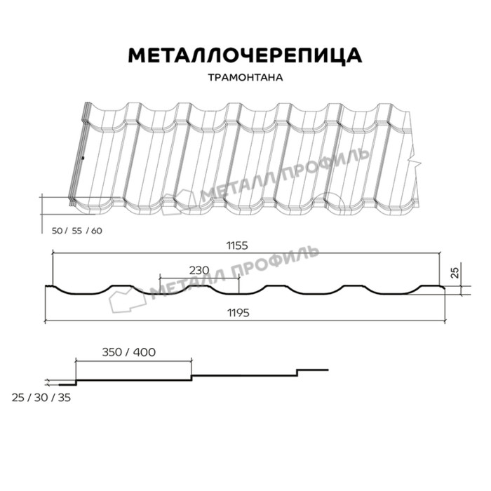 ТРАМОНТАНА — это новый профиль металлочерепицы от Компании Металл Профиль. Выбирайте и комбинируйте необходимую глубину (50, 55 и 60 мм) профиля, высоту (25, 30 или 35 мм) и длину (350 и 400 мм) ступени. Это отличное решение для скатов средней и большой площади. Металлочерепица ТРАМОНТАНА отличается необычным внешним видом — широким прогибом и узким гребнем волны. Это жёсткий симметричный профиль, адаптированный к ветровым нагрузкам. ТРАМОНТАНА — подходящий вариант для надёжной и оригинальной кровли!